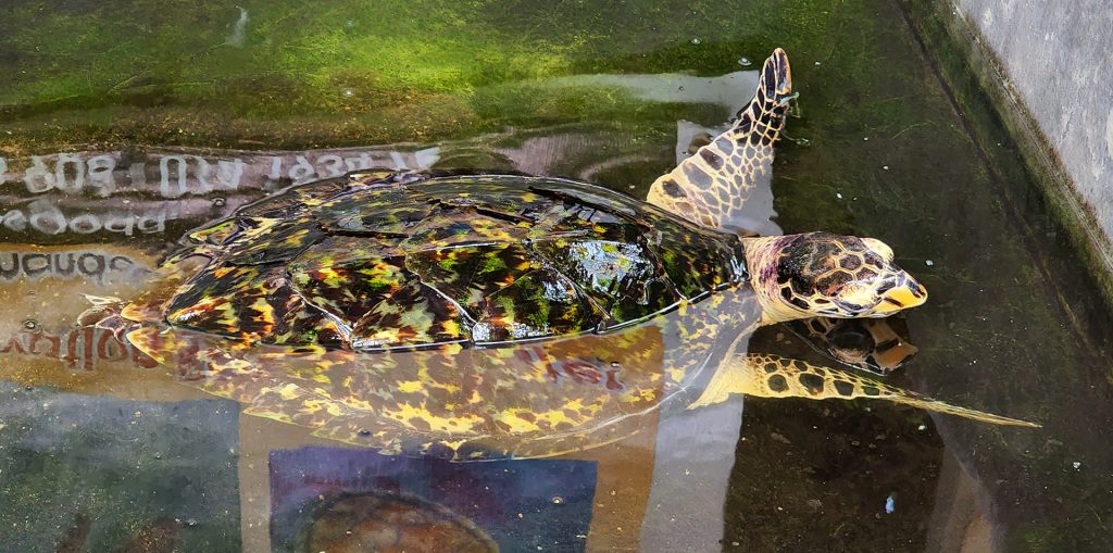 After a massive “American” breakfast, which is an English breakfast with a whole lot of decadence piled on top, we headed to the beach to have a look at some turtles. Lokka was out with several buddies and they made a strong appeal not to go to “that commercial hatchery” and to come to their hatchery which did not charge fees and was run on donations only. We were in a compliant mood, so we followed them into the village. The hatchery was a small affair – it was obvious they were operating on a shoestring budget. It comprised a sandy section with labels indicating dates on which eggs had been buried and several rough concrete tanks filled with seawater. There were small hatchlings a few days old that were being kept for release into the ocean, and a few larger specimens with fishing net injuries that they were trying to nurse back to health.