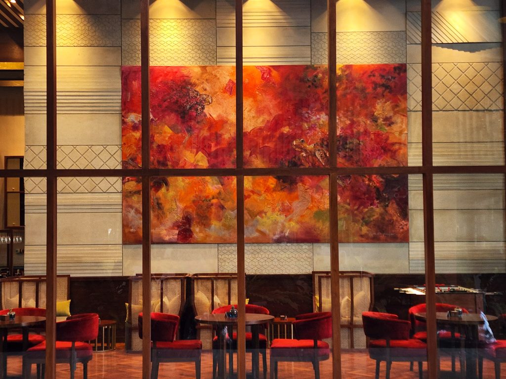 Massive red painting with turtles in the Sheraton bar, opposite the lobby