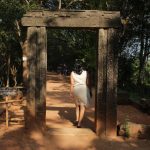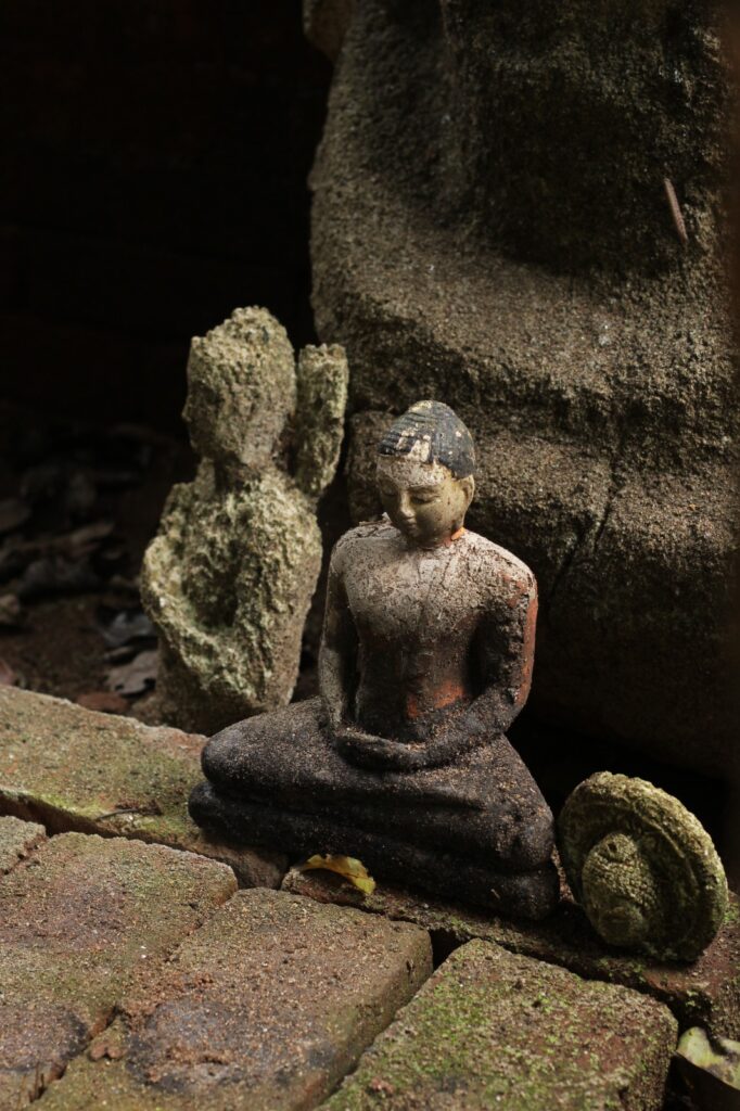 The archeological complex is huge and spread out. Before us is a chaitya of brown brick. Behind it the mist drifts up white and ghostly, half covering the mountains. It’s a place of quietness and it must have felt like this a thousand years ago. There are steps leading up to the chaitya, flanked by guard stones which are half worn away now. A few clay lamps have been placed on the stone platform before the chaitya.