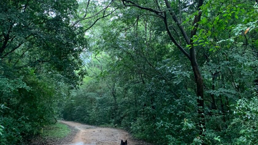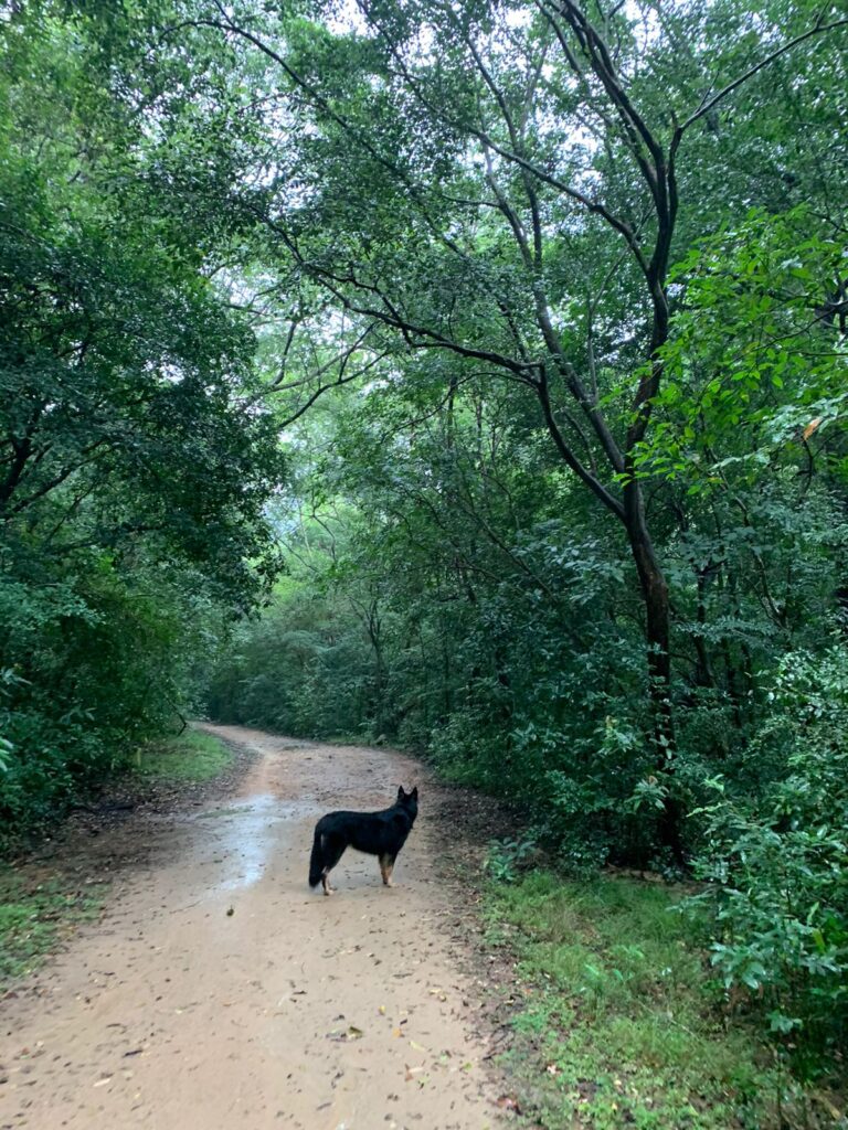 As you drive further from Dambulla town, the road gets narrower and more uneven. It starts as a regular gravel road which transforms into a narrow sandy path pitted with rocks. Kades and small houses are replaced by trees. The only sound is the noise of the car engine. It’s raining and sand becomes mud, the tires skid on the ground. There is the sharp, ominous sound of rock scraping against the under carriage. We leave the car parked by the side of the path and walk. And walk and walk. There is not another soul around. The rain is heavy now, there is the sound of thunder and birds chittering from the trees. Dog tries to catch birds and shadows in the forest. There is elephant dung on the road and no signal on our phones. I think of smashed cars, how fast elephants can move and whether Dog will forgive us for if we never find our way out of here. But Dog is unbothered, she trots on, her tail waving like a jaunty flag, she has to lead the sheep who might otherwise go astray. We turn a corner and before us – I have never been so happy to see one before – is a motor cycle. Other humans are here.