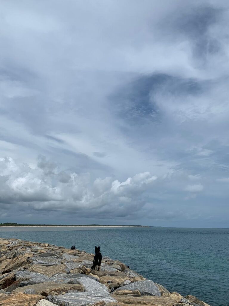Kalametiya harbour. Noon. There are different shades at the place where the water meets – the dark of the river water and the lighter blue of the ocean, the demarcation between the two a line drawn in water.